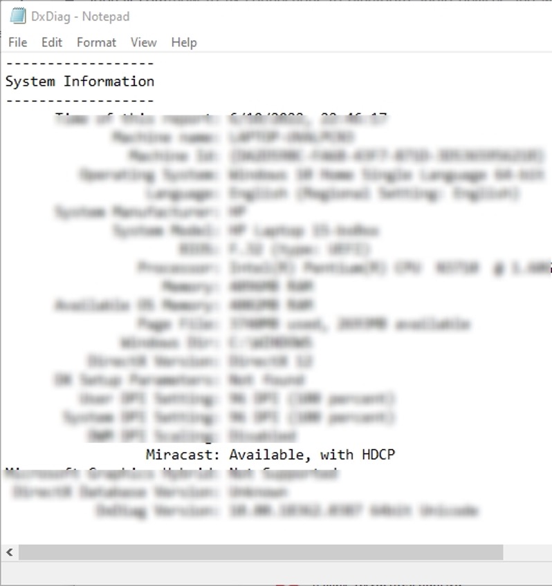 3.Öffnen Sie nun die Textdatei und darunterSysteminformationen, suchen Sie nach „Miracast: Verfügbar, mit HDCP“.