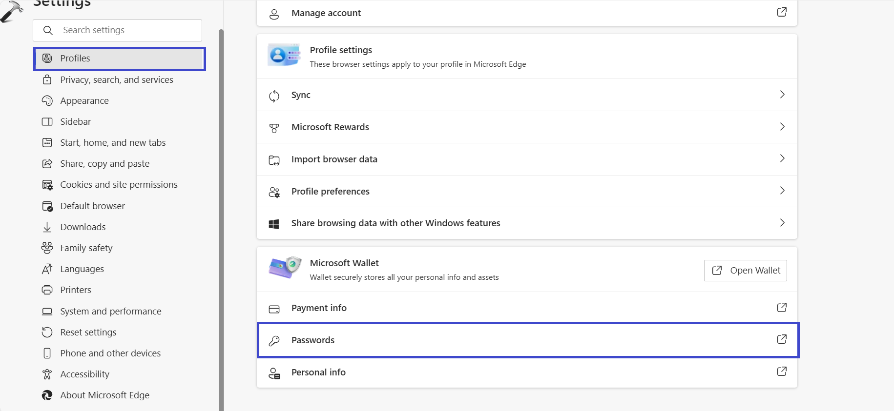 2. Gehen Sie zu Profile. Scrollen Sie nach unten und klicken Sie auf „Passwörter“.