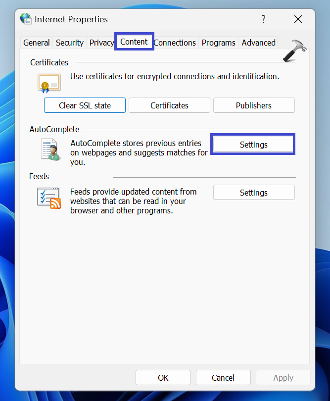 2. Ein Fenster mit den Interneteigenschaften wird angezeigt. Gehen Sie zu „Inhalt” Tab und klicken Sie auf „Einstellungen” unter demAutoVervollständigenAbschnitt.
