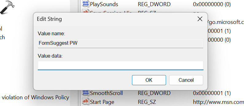 3. Doppelklicken Sie im rechten Bereich auf „FormSuggest PW„. Geben Sie die Wertdaten ein und klicken Sie auf OK.