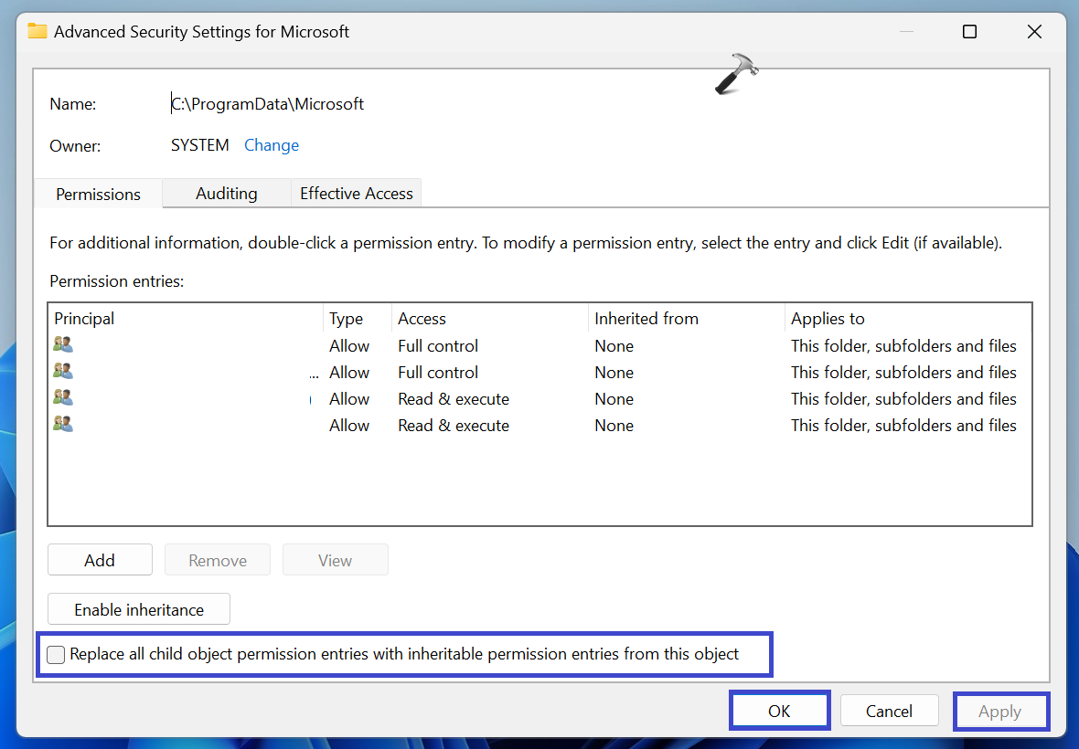 6. Überprüfen Sie abschließend das „Ersetzen Sie alle Berechtigungenseinträge für untergeordnete ObjekteKlicken Sie auf „OK“ und anschließend auf „Übernehmen“.