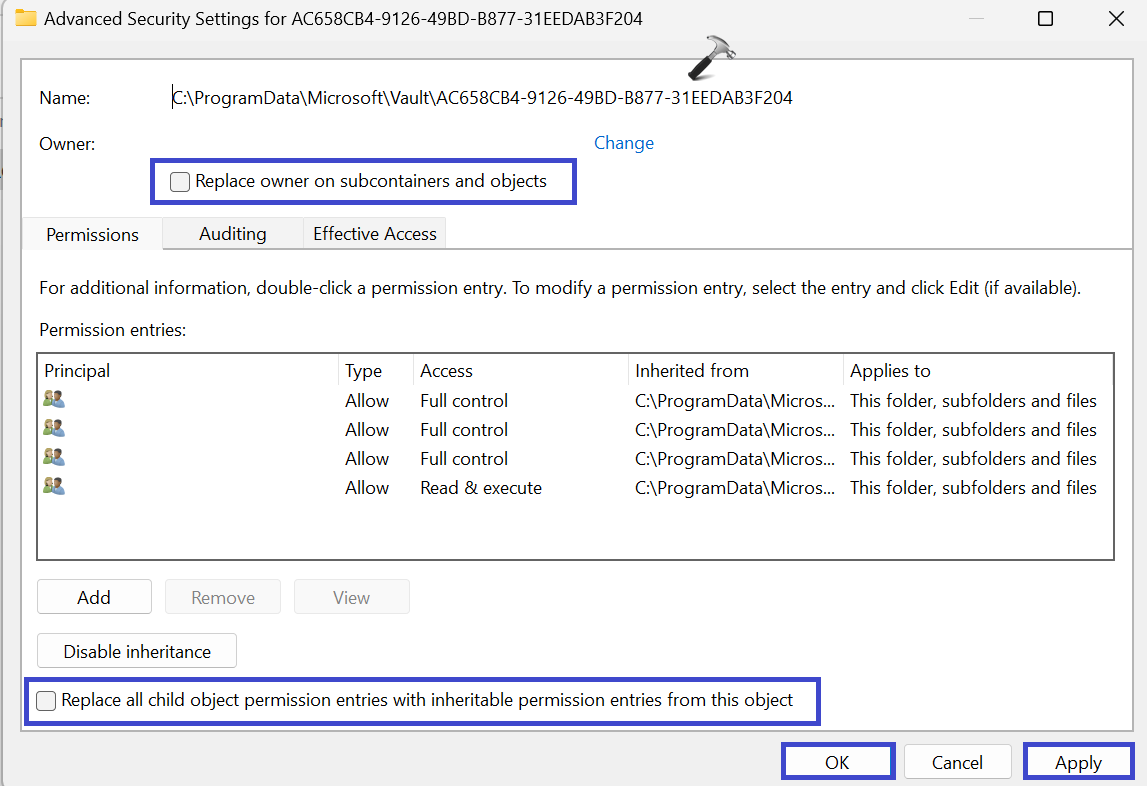 6. Überprüfen Sie abschließend das „Ersetzen Sie den Besitzer für Untercontainer und Objekte" Und "Ersetzen Sie alle Berechtigungseinträge für untergeordnete Objekte”-Boxen.