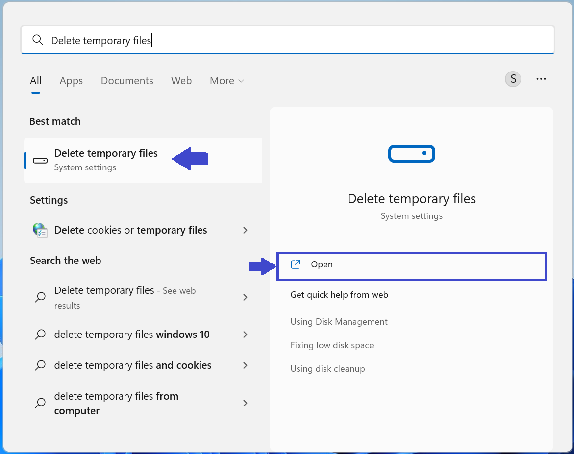 1. Geben Sie „Temporäre Dateien löschen“ in das Suchfeld ein und klicken Sie auf „Öffnen“.