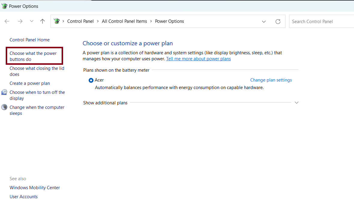 2. Klicken Sie anschließend links im Fenster „Energieoptionen“ auf die Option „Auswählen, was der Netzschalter tun soll“.