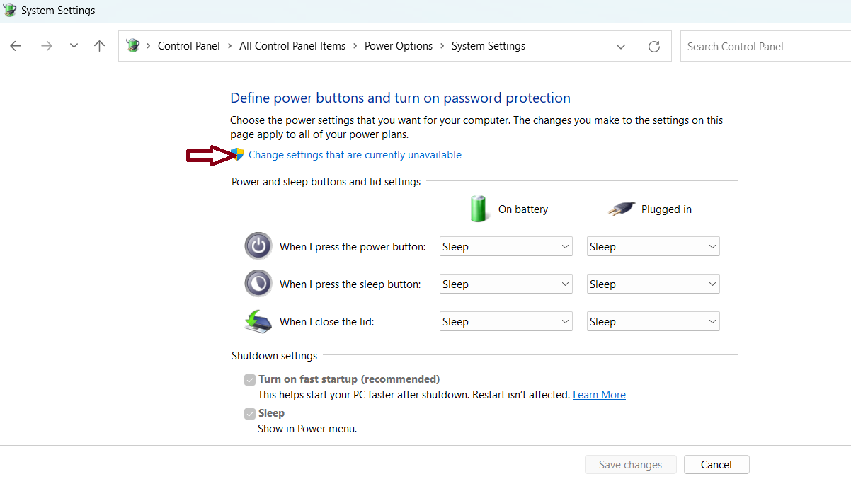 4. Klicken Sie auf „Einstellungen ändern, die derzeit nicht verfügbar sind“, wenn diese Option nicht aktiviert ist. Dadurch werden die Felder in „Einstellungen zum Herunterfahren“ aktiviert. Sie können nun auf das Kontrollkästchen neben „Schnellstart aktivieren (empfohlen)“ klicken.