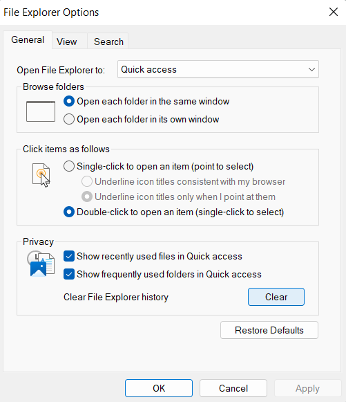 Der Datei -Explorer speichert seine eigenen Cache -Dateien, die aus Ihrem Suchverlauf bestehen. Wenn diese Cache -Dateien beschädigt sind, verursachen sie möglicherweise Fehler bei der Verwendung von Datei -Explorer. Eine Option besteht also darin, diese Dateien zu löschen. So machen Sie es:
