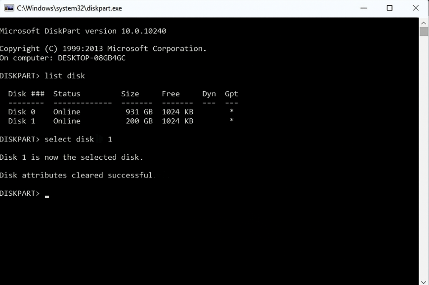 Schritt 5:Als nächstes drücken Sie die Eingabetaste amAttribute Disk klar readonlyBefehl. Drücken Sie erneut die Eingabetaste.