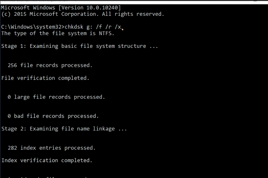 Schritt 2:Typchkdsk g: /f /r /xSchreiben Sie Schutz auf Festplatten.