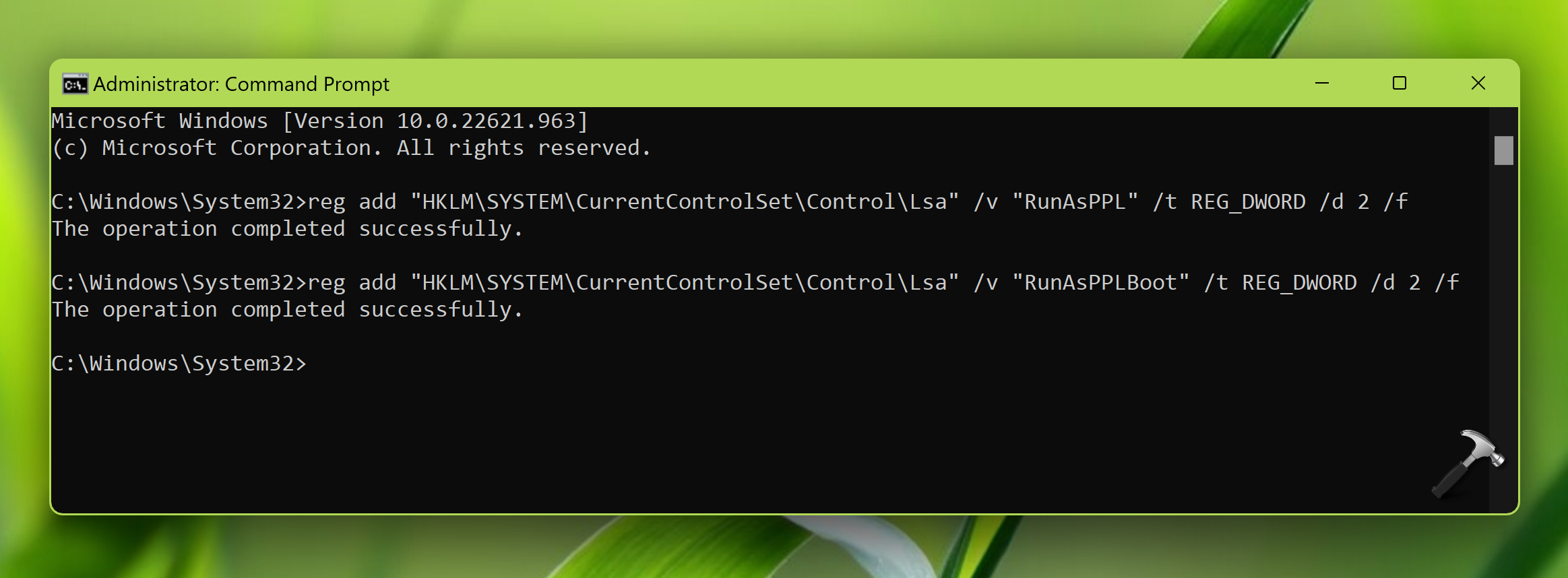 reg add "HKLMSYSTEMCurrentControlSetControlLsa" /v "RunAsPPL" /t REG_DWORD /d 2 /f