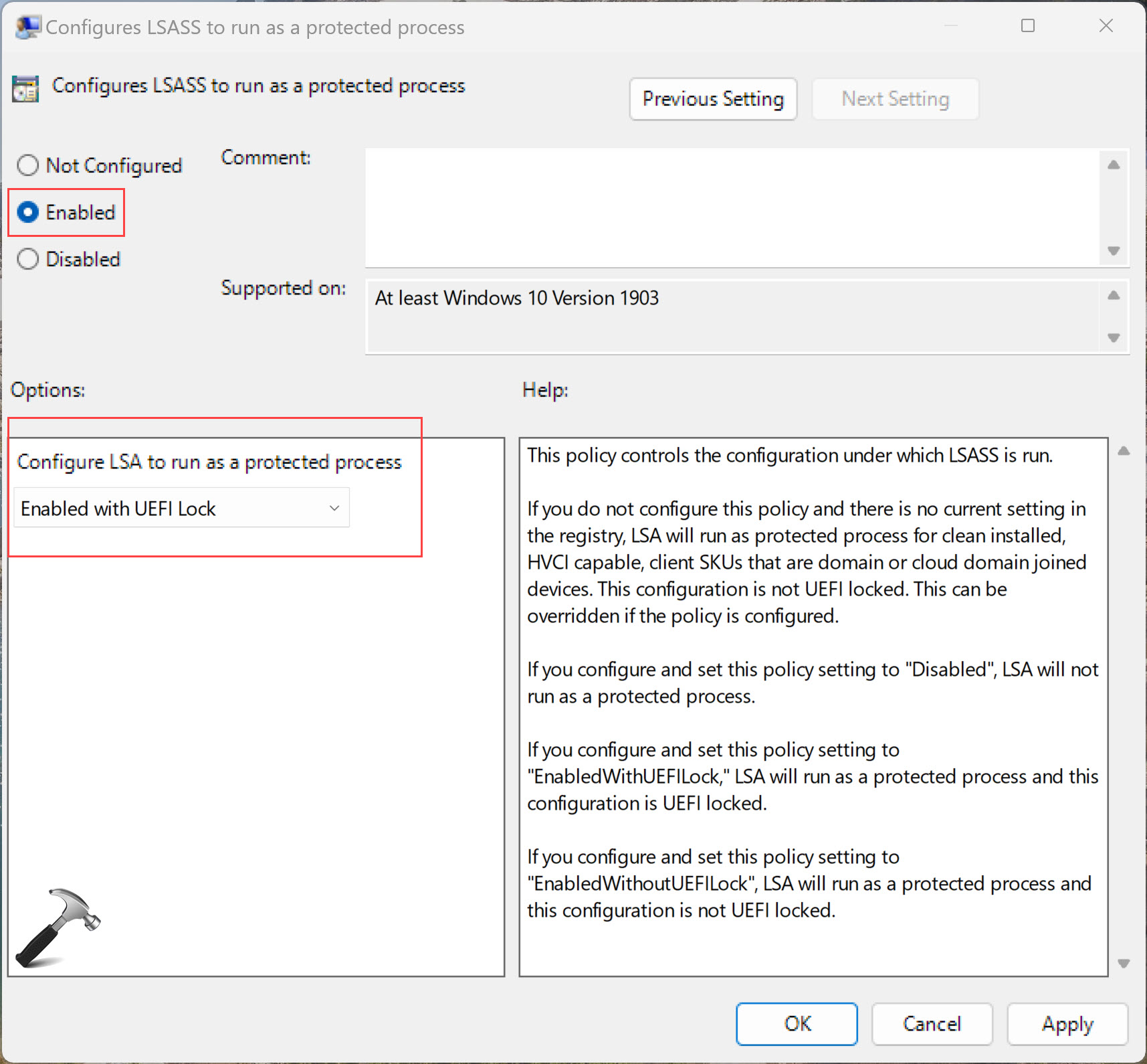5. Klicken Sie dann auf das Dropdown-Menü unter „LSA für die Ausführung als geschützter Prozess konfigurieren“ und wählen Sie „Mit UEFI-Sperre aktiviert“ aus.