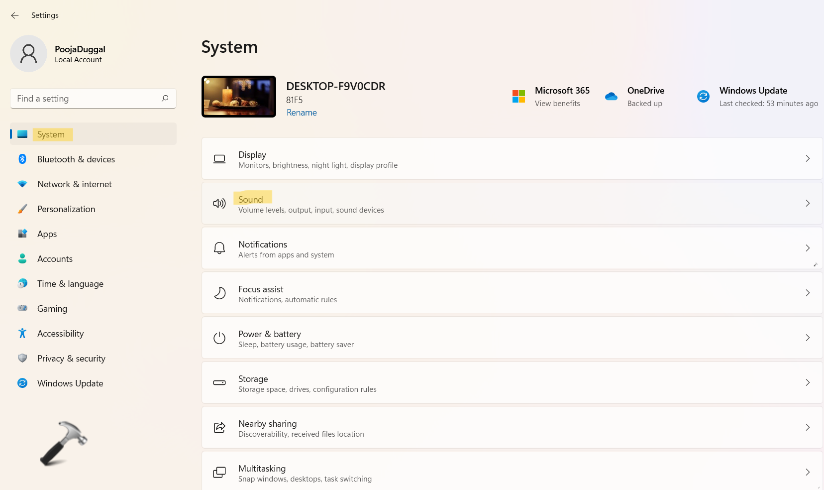 1.OffenEinstellungendurch Drücken der TasteWindows + ITabulatoren auf Ihrer Tastatur zusammenfügen. Gehen Sie danach zuSystemKlicken Sie auf die Registerkarte und wählen Sie dann ausKlangauf der rechten Seite vorhanden.