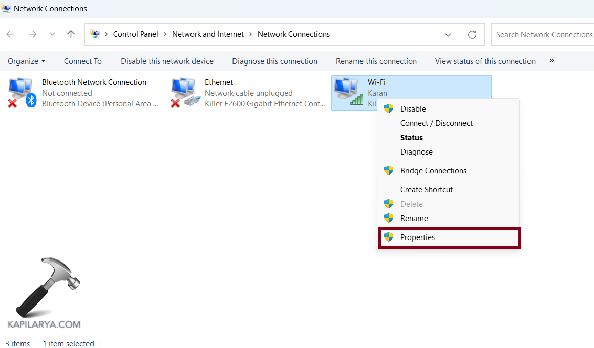 2. Klicken Sie mit der rechten Maustaste auf das Netzwerk, das Sie derzeit verwenden, und wählen Sie „Eigenschaften“.