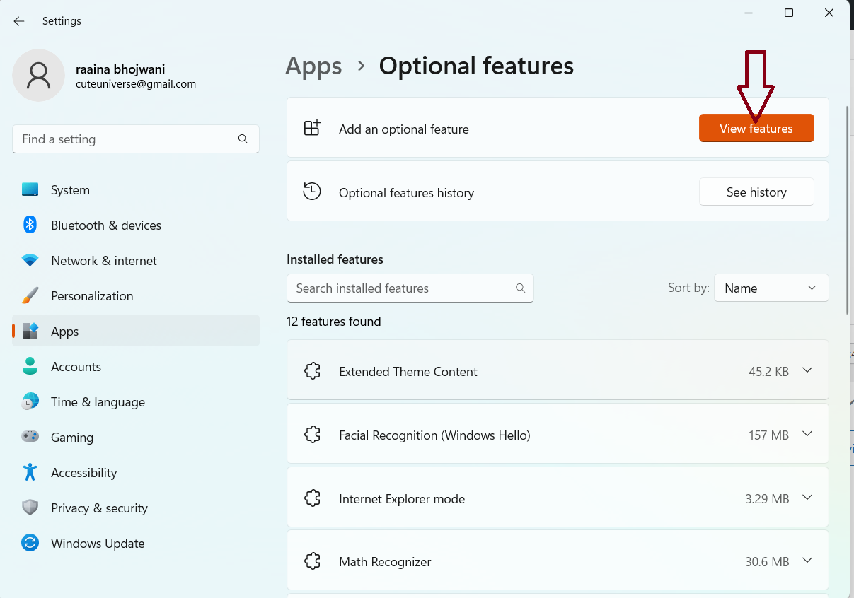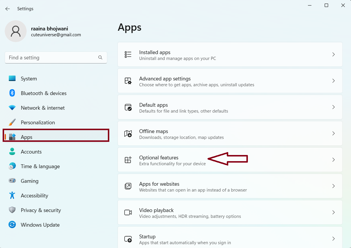 2. Klicken Sie auf Apps > Optionale Funktionen.