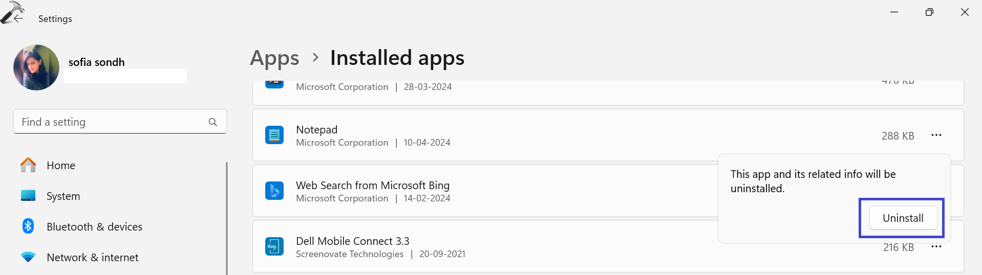 2. Suchen Sie Notepad. Klicken Sie auf (…) und wählen Sie „Deinstallieren“.