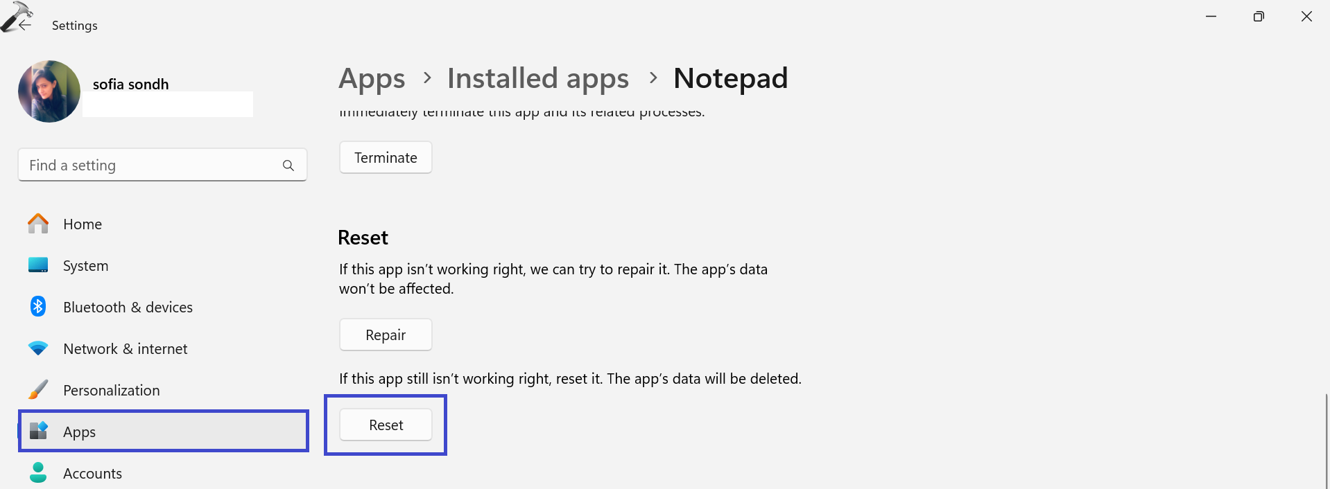 Fix 3: Notepad reparieren oder zurücksetzen