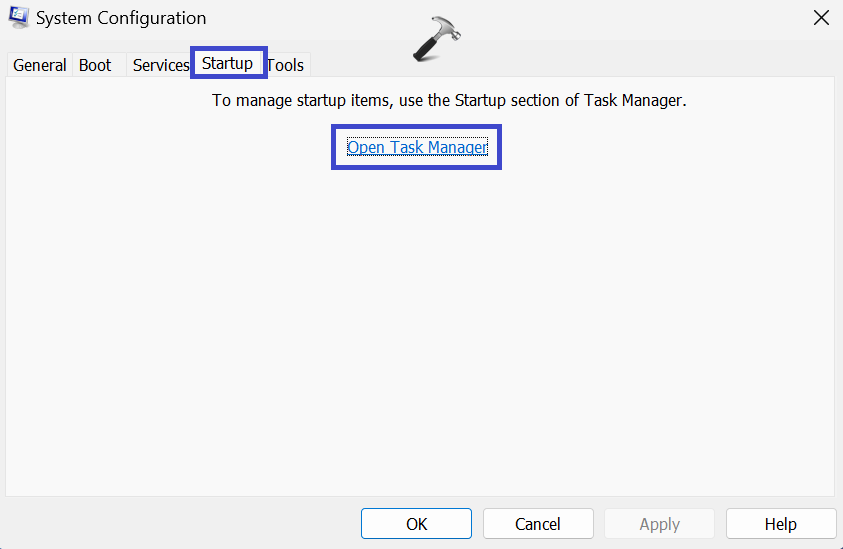 4. Gehen Sie nun zuStart-upTab. Klicken Sie auf „Öffnen Sie den Task-Manager”-Option.
