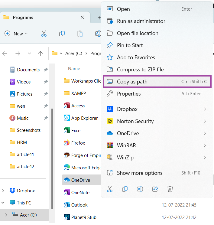 2. Klicken Sie im Datei-Explorer mit der rechten Maustaste auf OneDrive und wählen Sie „Kopieren“ als Pfad.