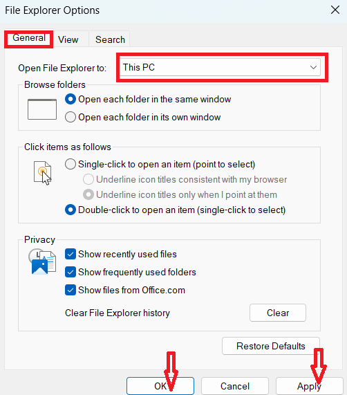 - Wählen Sie dann die ausAllgemeinTab und hineinÖffnen Sie den Datei-ExplorerwählenDieser PC.