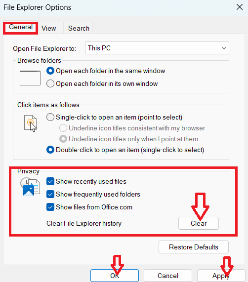 - Wählen Sie die ausAllgemeinTab und gehen Sie zuPrivatsphäreAbschnitt. Klicken Sie dann aufKlar>Anwenden>OK.