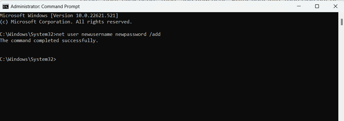 - Geben Sie den folgenden Befehl mit dem neuen Benutzernamen und dem neuen Passwort ein.