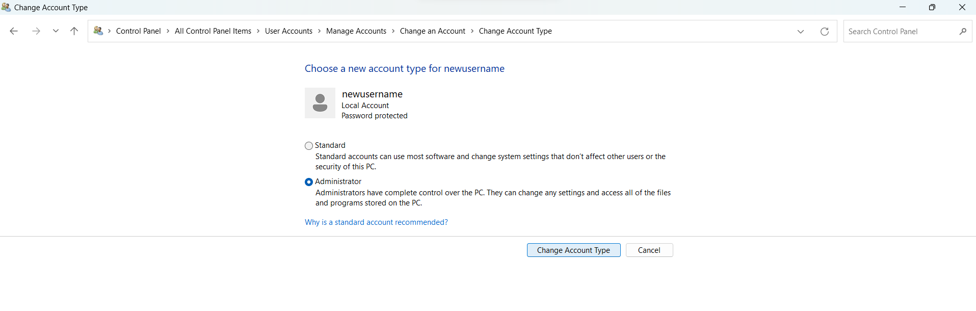 - Gehe zuÄndern Sie den Kontotypund auswählenAdministrator. Klicken Sie auf Kontotyp ändern.