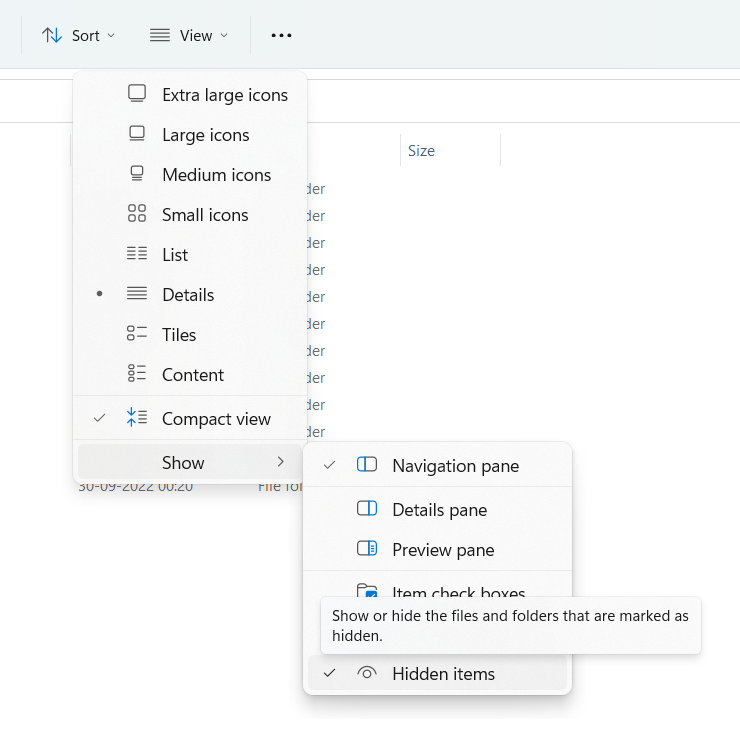 - Öffnen Sie den Datei-Explorer in diesem neuen Konto und gehen Sie zuSystemfestplatte. Hier klicken Sie aufAnsicht > Anzeigen > Ausgeblendete Elemente.
