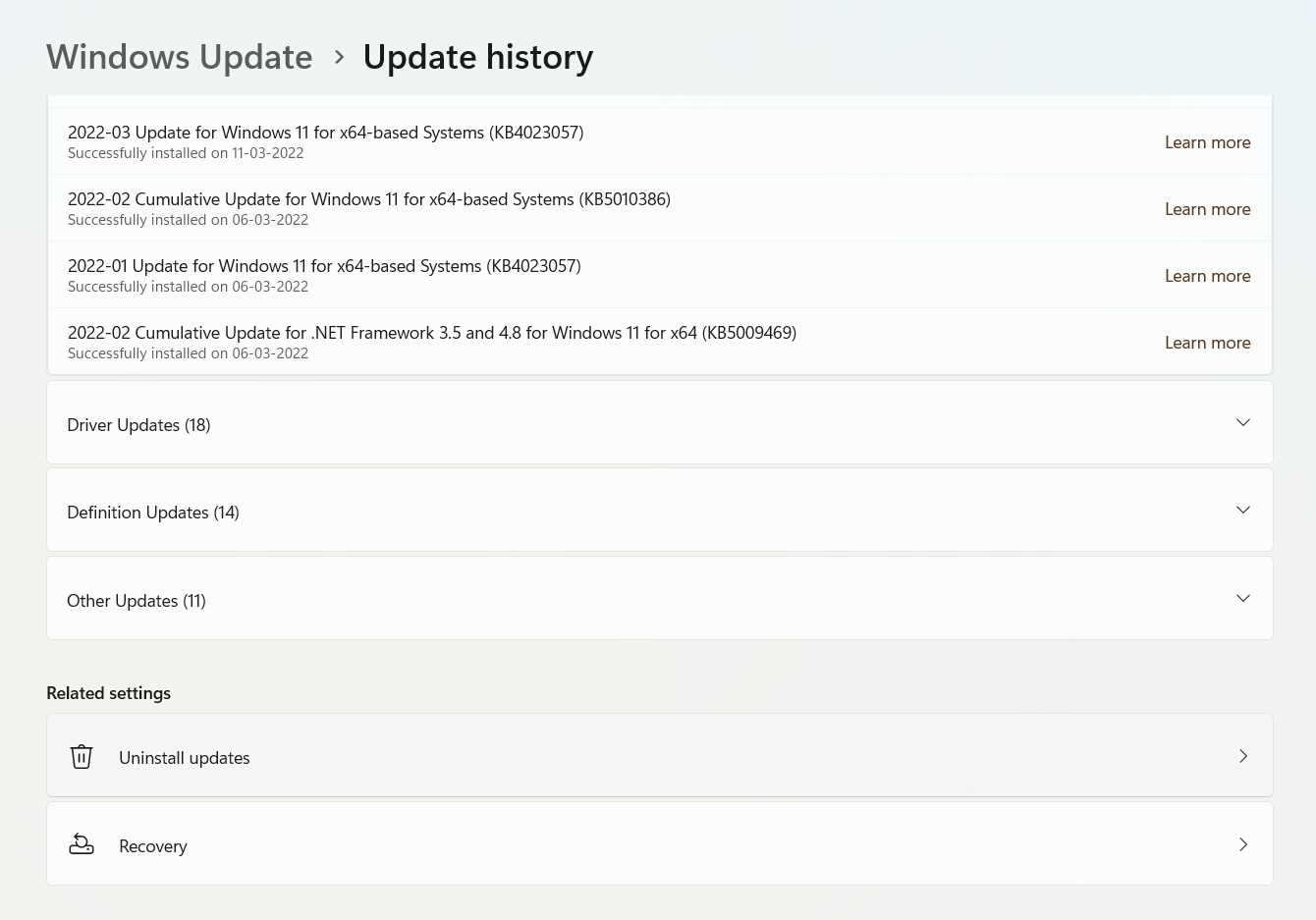 - Gehe zuAbschnitt „Windows-Update“.in den Einstellungen und wählen SieUpdate-Verlauf. Überprüfen Sie hier, ob das Datum Ihres Updates mit dem Datum übereinstimmt, zu dem die App nicht mehr funktioniert.