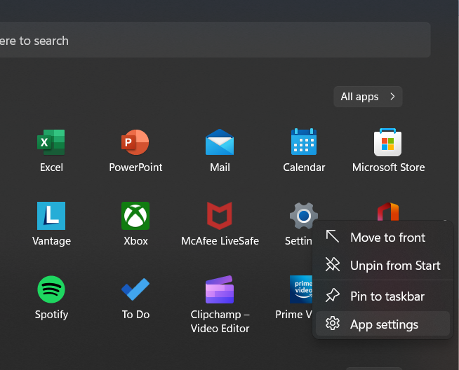 - Öffnen Sie das Windows-Menü und klicken Sie mit der rechten Maustaste daraufEinstellungssymbol. WählenApp-Einstellungen.