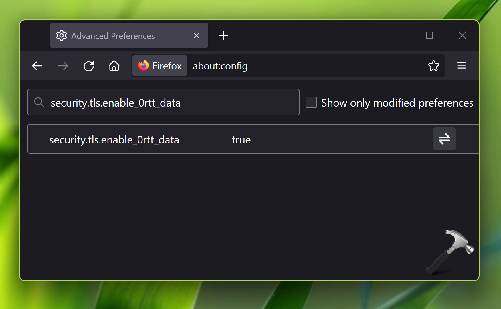 security.tls.enable_0rtt_data. Da Sie mit diesem Problem konfrontiert sind, muss es auf „True“ gesetzt sein. - Klicken Sie dort auf die Umschalttaste und stellen Sie sie auf einFALSCH.
