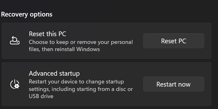 - Klicken Sie dann aufWiederherstellungsoptionund drücken Sie die TastePC zurücksetzenTaste.