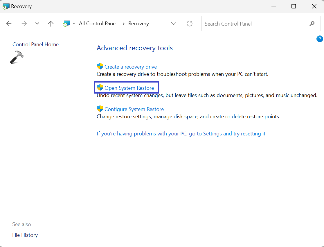 2. Klicken Sie auf „Öffnen Sie die Systemwiederherstellung„.