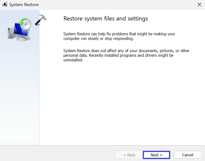 Methode 4: Behebung: „Beim Zurücksetzen Ihres PCs ist ein Problem aufgetreten“ mithilfe der Systemwiederherstellung