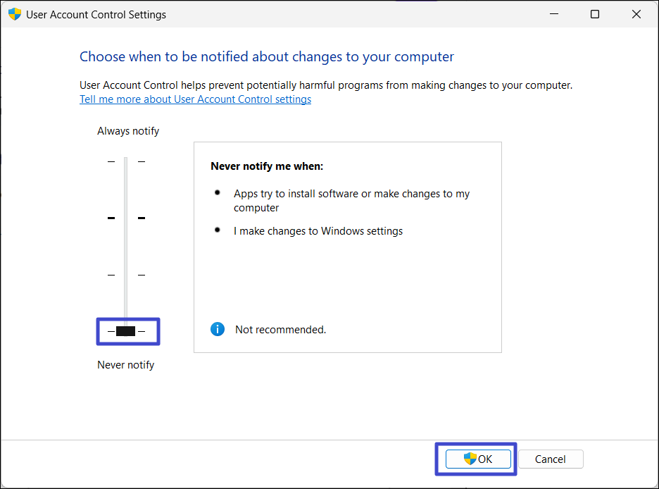 2. Ziehen Sie im Fenster „Benutzerkontensteuerungseinstellungen“ den Schieberegler nach unten und klicken Sie auf „OK“.