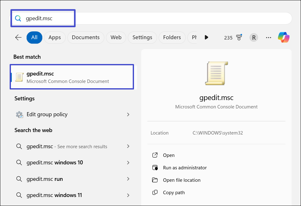 1. Öffnen Sie das Startmenü und geben Sie „gpedit.msc“, und drücken Sie die Eingabetaste.