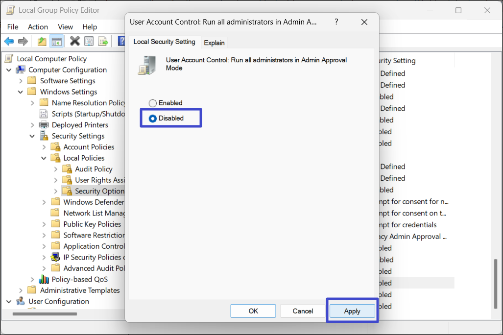 4. Wählen Sie „Deaktiviert” und klicken Sie auf „Anwenden“.