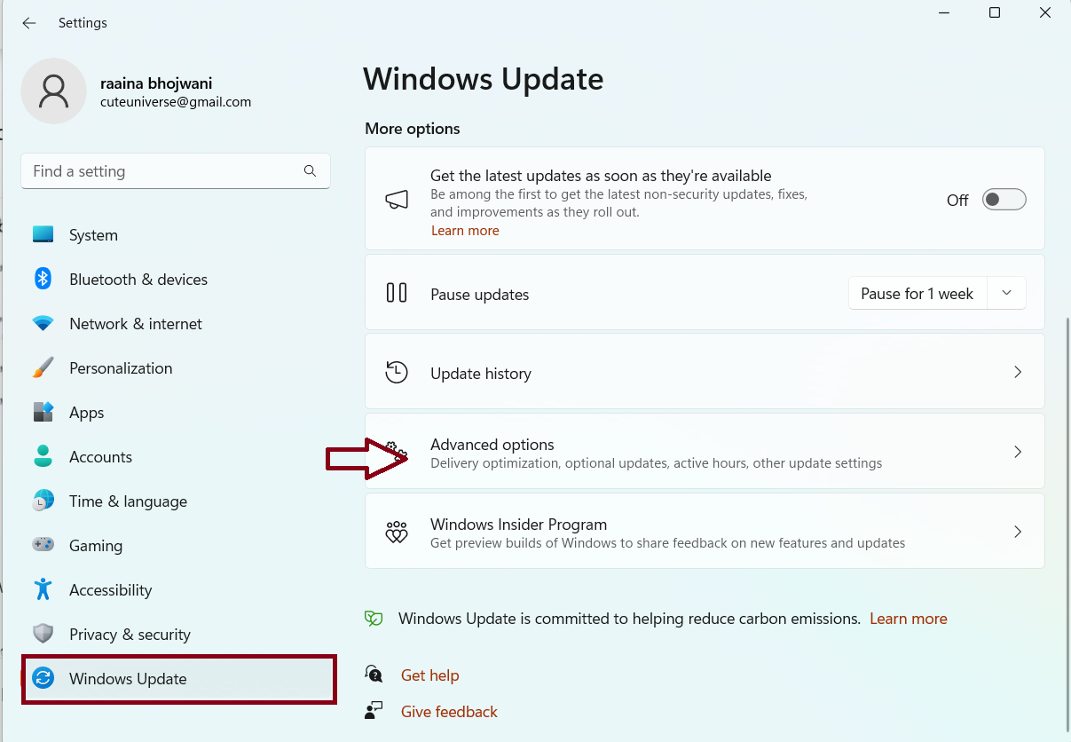 4. Gehen Sie zu Windows Update > klicken Sie auf Erweiterte Optionen.