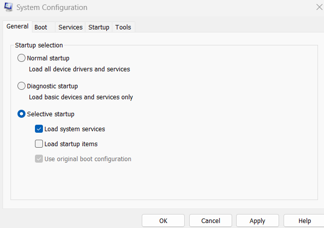 2. Deaktivieren Sie das Kontrollkästchen Normaler Start und aktivieren Sie die Kontrollkästchen Systemdienste laden und Original-Startkonfiguration verwenden. Klicken Sie auf OK.