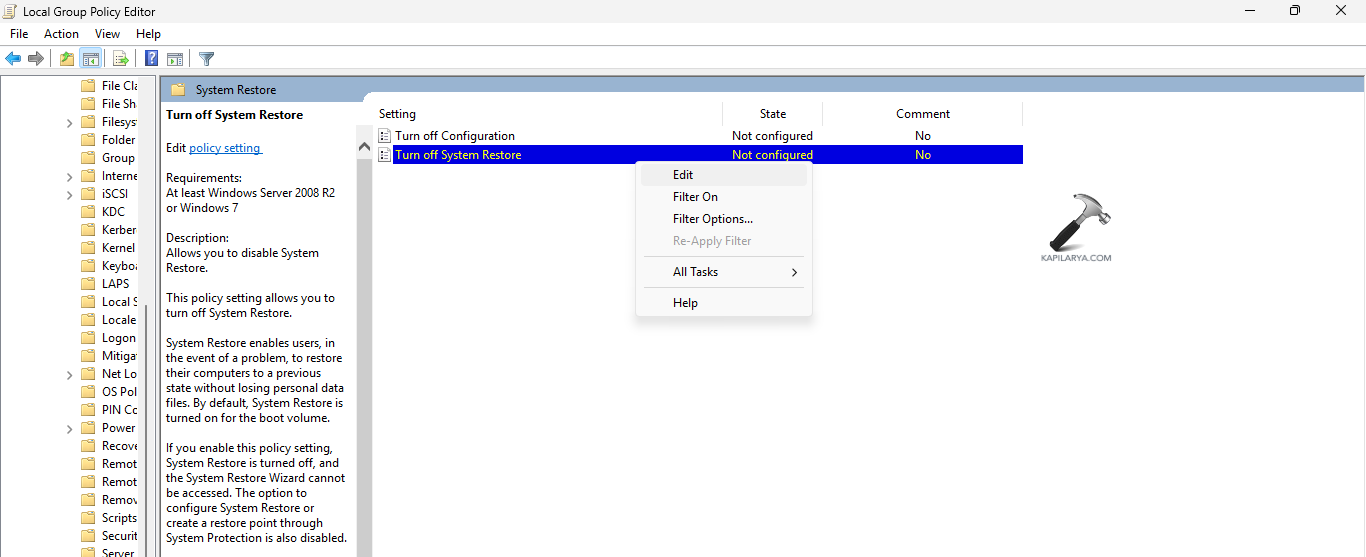 Schritt 4-Klicken Sie nun mit der rechten Maustaste auf „Systemwiederherstellung deaktivieren“ und wählen Sie „Bearbeiten“.