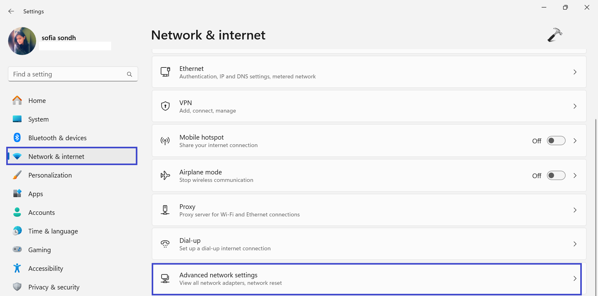 1. Öffnen Sie die Einstellungen-App. Unter "Netzwerk & Internet“, klicken Sie auf „Erweiterte Netzwerkeinstellungen”-Option.