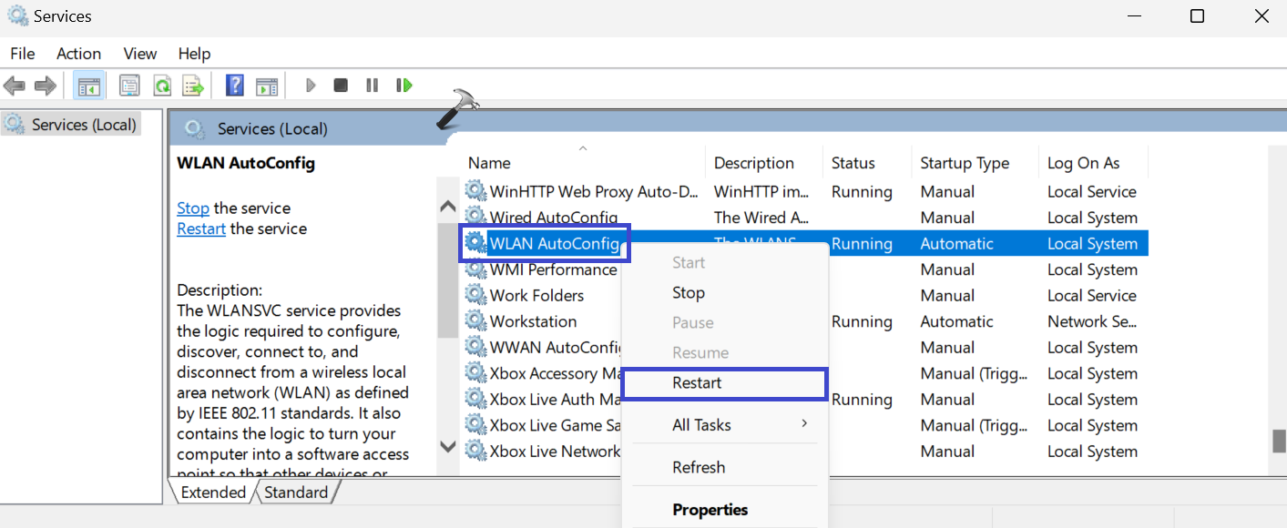 2. Klicken Sie mit der rechten Maustaste auf „WLAN-Autokonfiguration” Option und wählen Sie „Neustart“.