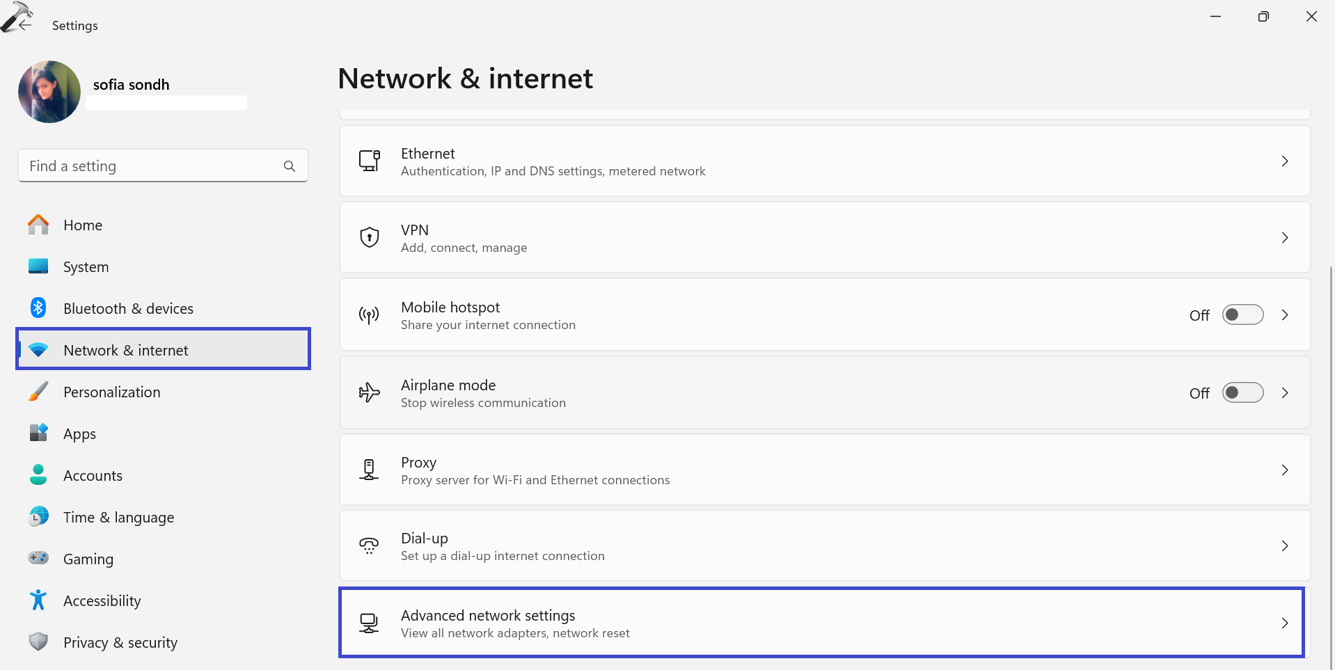 1. Öffnen Sie die Einstellungen-App. Navigieren Sie zu „Netzwerk & Internet” und klicken Sie auf „Erweiterte Netzwerkeinstellungen“.