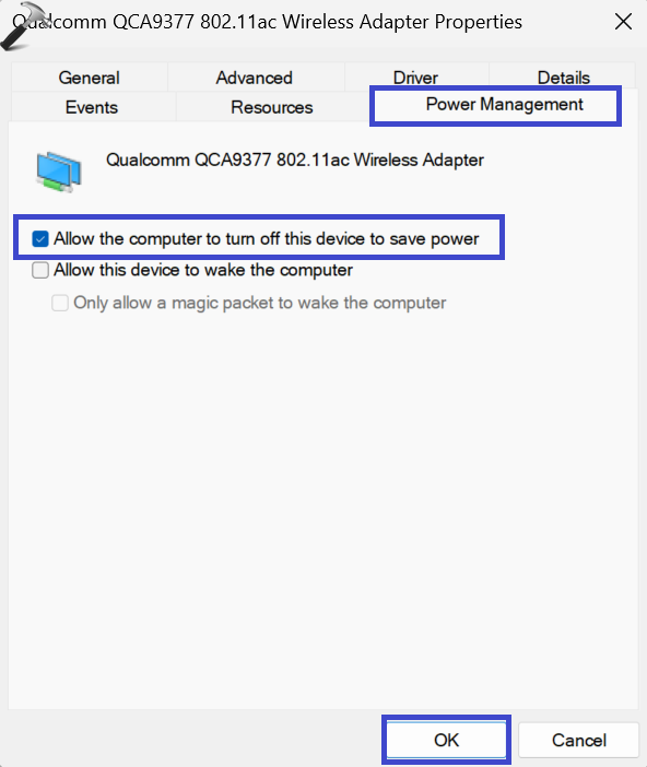 Deaktivieren Sie das „Erlauben Sie dem Computer, dieses Gerät auszuschalten, um Strom zu sparen”-Option.