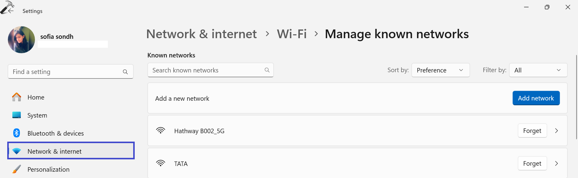 2. Wählen Sie im rechten Bereich „Verwalten Sie bekannte Netzwerke”-Option.