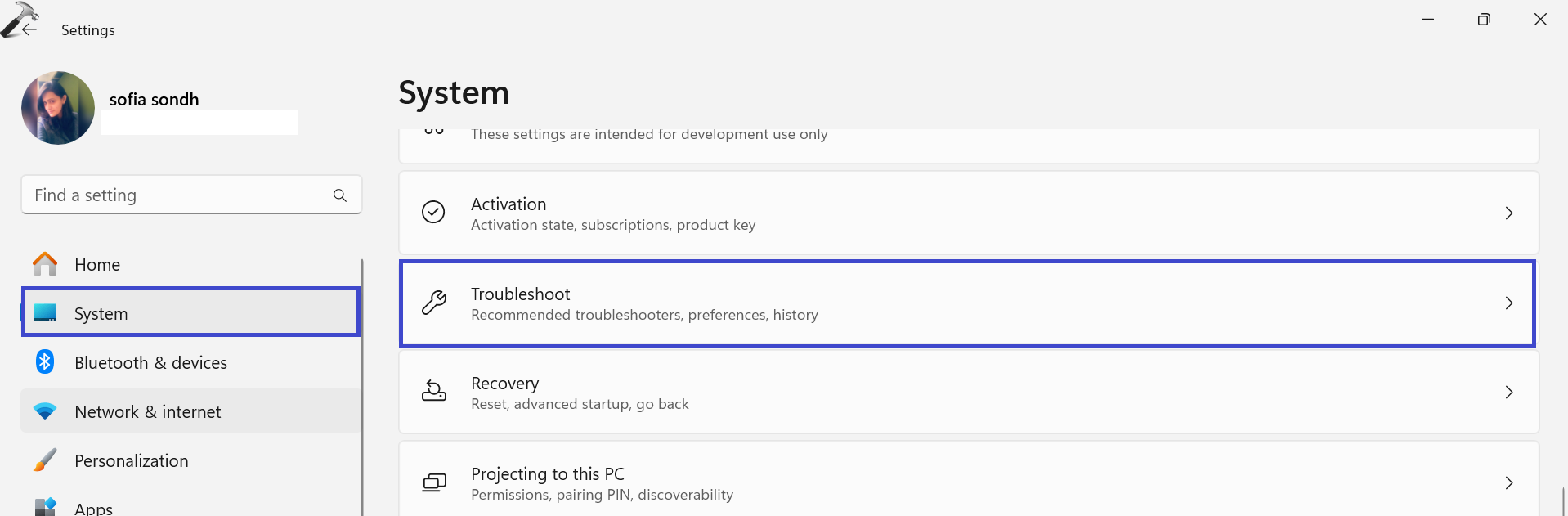 1. Navigieren Sie zu „„Einstellungen => System => Fehlerbehebung“.