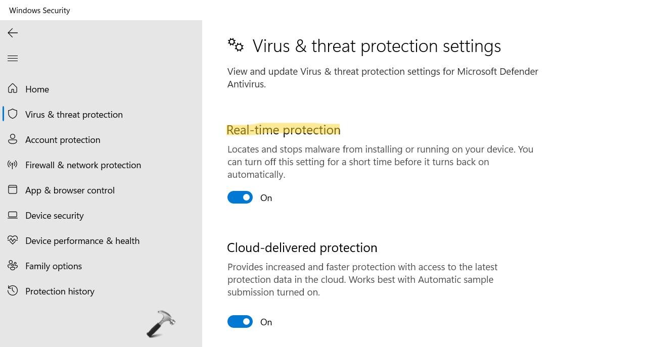 7.Auch imEinstellungen für den Viren- und Bedrohungsschutz, aktivieren Sie dieEchtzeitschutzdurch Drehen des KnebelsAn.