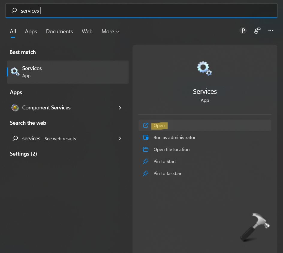 1.Öffnen Sie zunächst dieDienstleistungenDienstprogramm über WindowsSuchen. TypDienstleistungenin der Suchspalte ein und klicken Sie aufOffen.