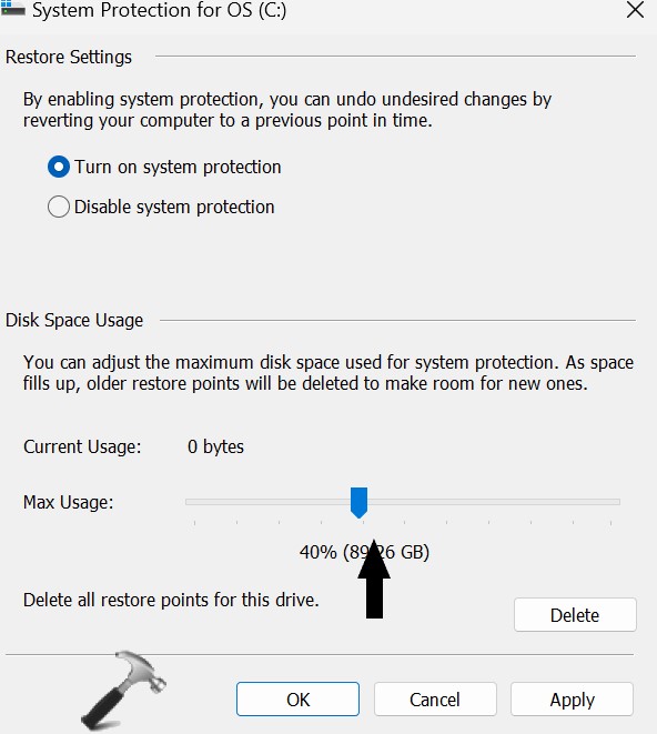 6. Klicken Sie nun aufSchieberegler „Max. Nutzung“.und wählen Sie den Speicherplatz aus, der zum Speichern der Wiederherstellungspunkte reserviert werden soll.