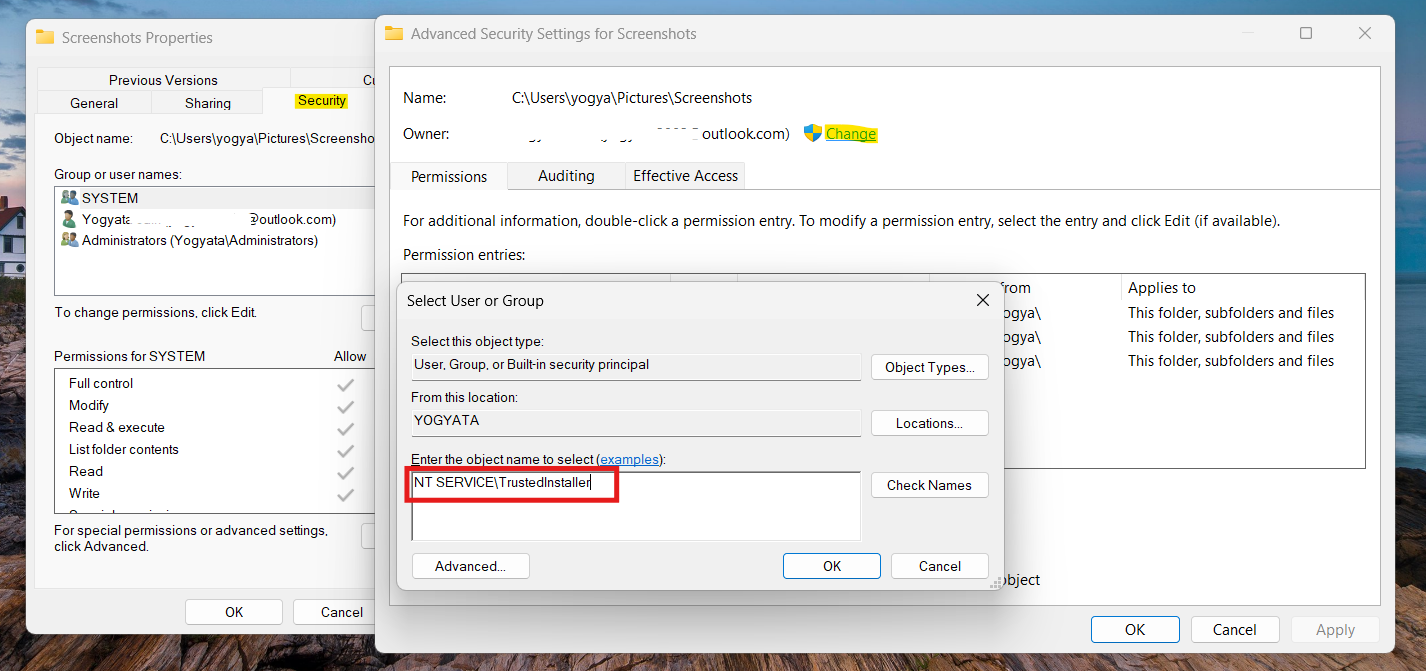 2. Klicken Sie unter „Eigentümer“ auf „Ändern“ und geben Sie einNT SERVICETrustedInstaller.