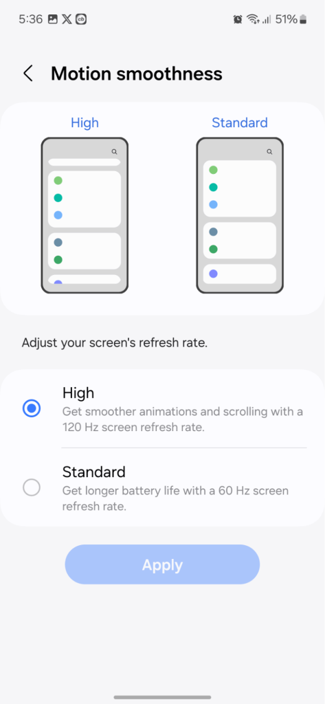 Wenn Sie ein Smartphone aus dem Jahr 2022 oder später besitzen, verfügt es wahrscheinlich über eine Anzeige mit einer Bildwiederholfrequenz von 120 Hz. Diese höhere Bildwiederholfrequenz verbessert zwar die flüssigen Animationen und Vorgänge, geht jedoch auch auf Kosten der Akkulaufzeit Ihres Telefons. Die Bildschirmaktualisierungsrate spielt eine wichtige Rolle bei der Batterieentladung, insbesondere in Verbindung mit den stromintensiven Anforderungen von 5G-Diensten. Um den Batterieverbrauch bei der Nutzung von 5G-Diensten zu verringern, sollten Sie die Bildwiederholfrequenz Ihres Geräts auf standardmäßige 60 Hz einstellen. Diese einfache Anpassung kann dazu beitragen, die Batterielebensdauer zu verlängern, ohne die Gesamtleistung zu beeinträchtigen.