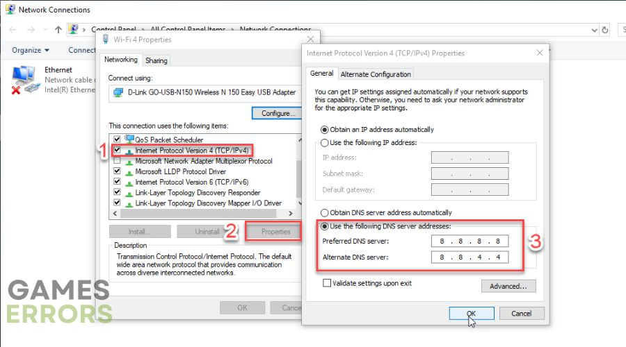6. FürBevorzugter DNS-Server, Typ:8.8.8.8, und fürAlternativer DNS-Server, Typ:8.8.4.4.